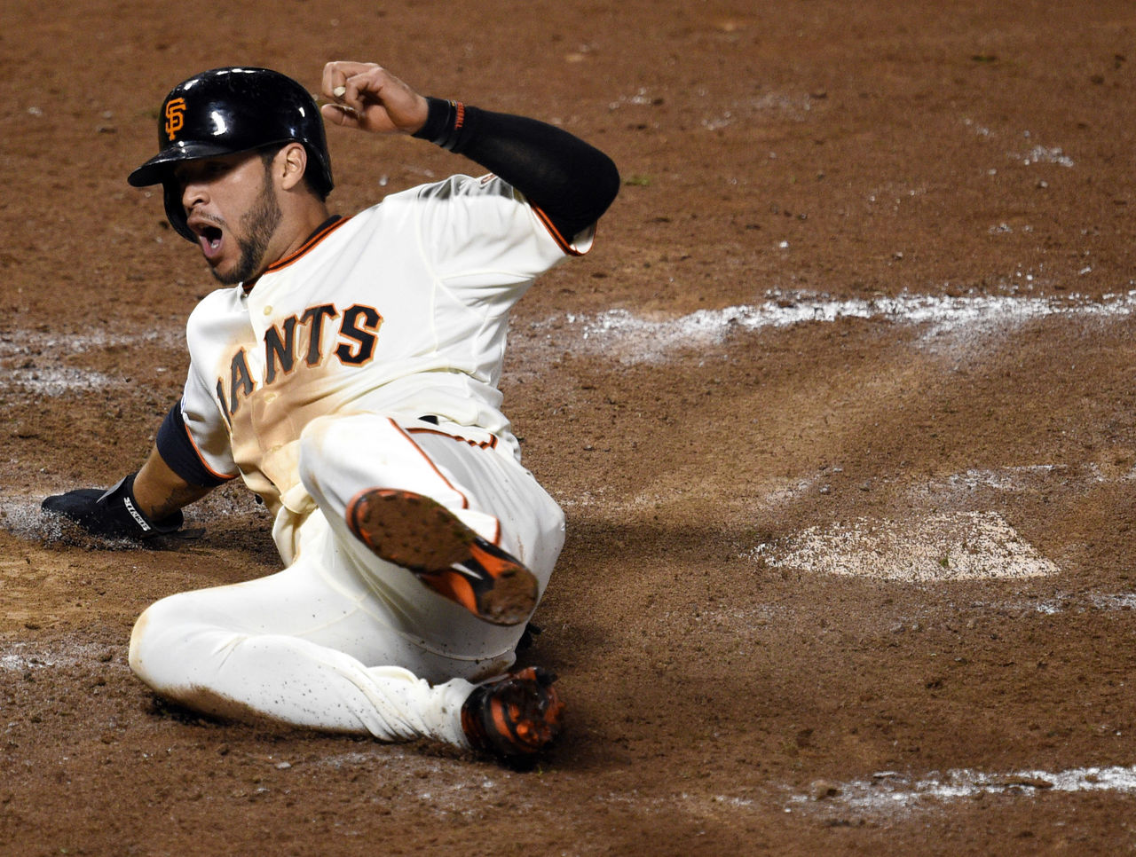 Gregor Blanco slides home safely on Joe Panik's seventh-inning double to give the Giants a 10-4 advantage.