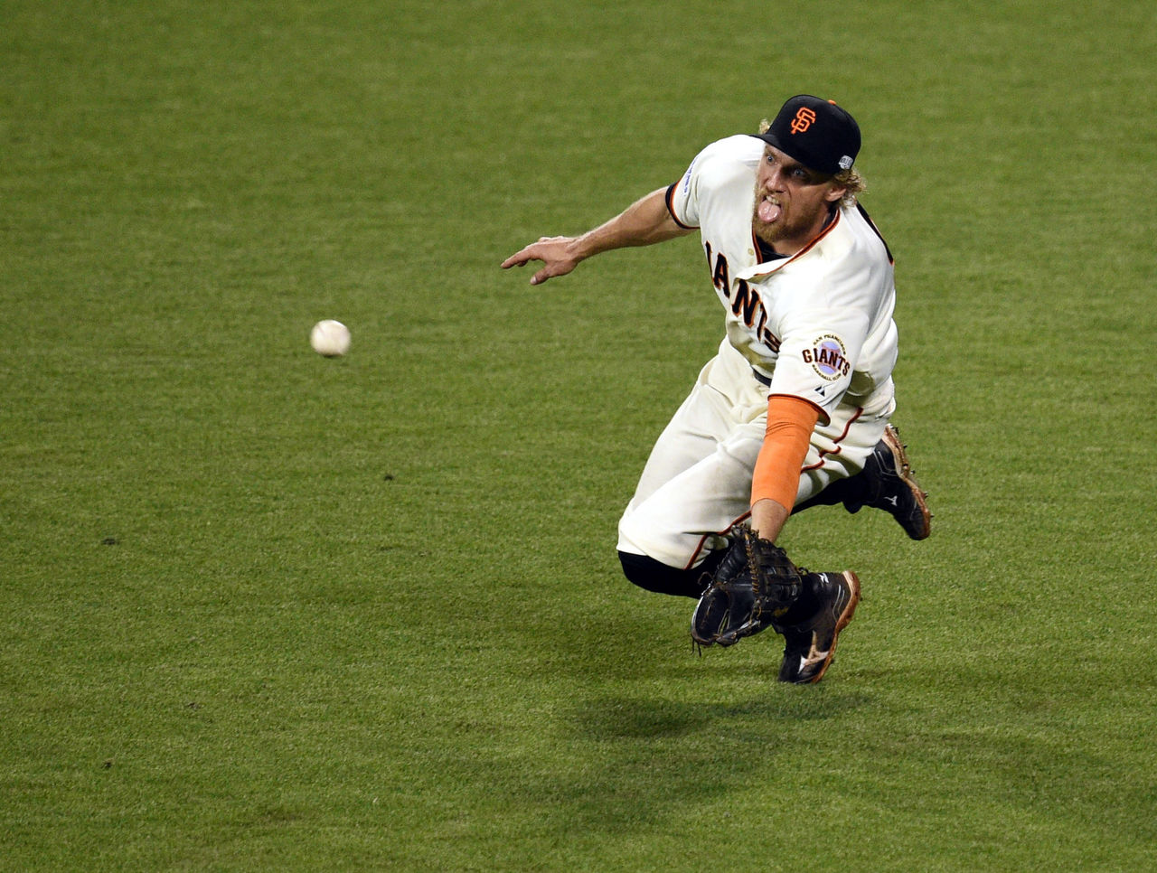 Hunter Pence makes a dazzling defensive play in the ninth inning on a sinking liner from Lorenzo Cain to bookend his team's series-evening victory at AT&T Park.