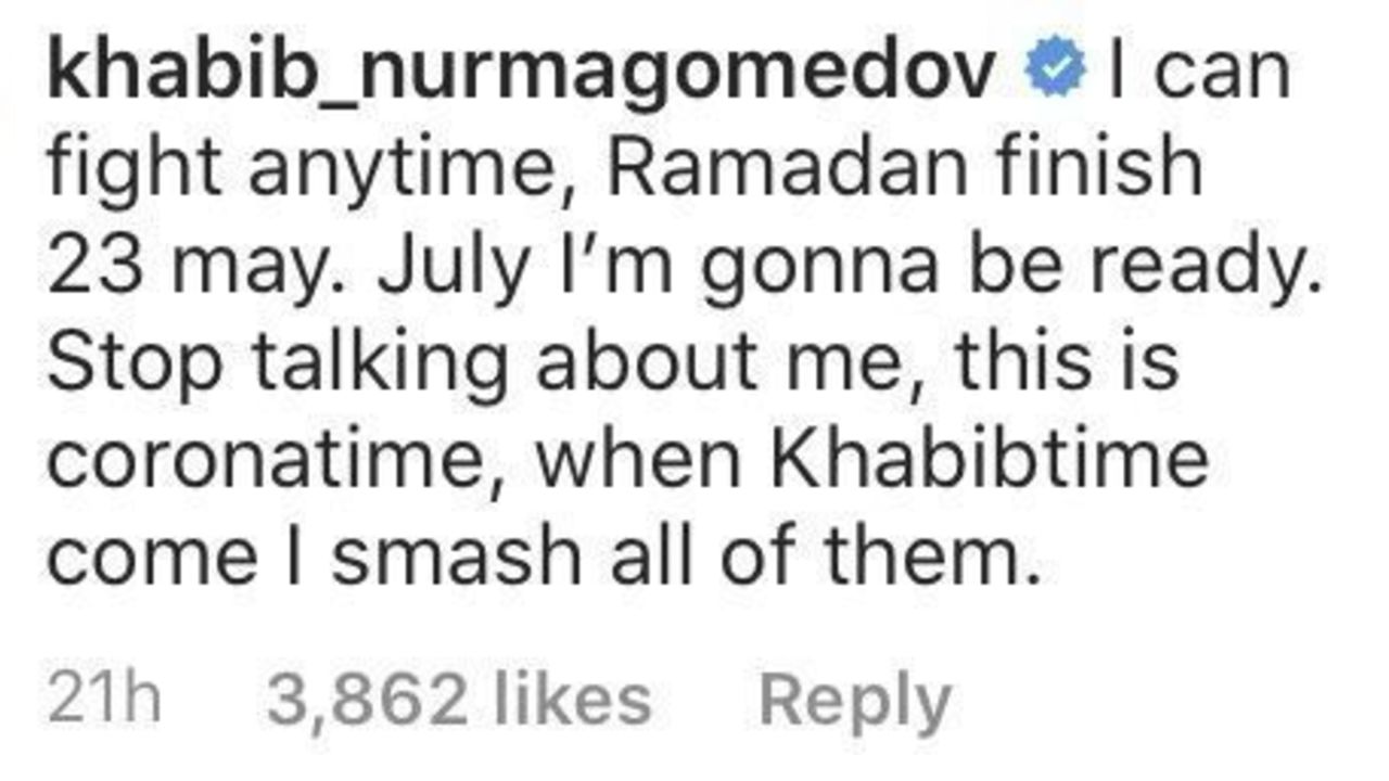 "July, I'm gonna be ready," Nurmagomedov wrote on Instagram. "Stop talking about me, this is corona time, when Khabib time come, I smash all of them."