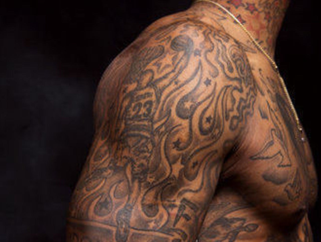 The silhouette of Vince dunking isn't the only basketball-related tattoo Smith has. He also has the NBA logo on his knuckle (he's married to the game), a Michael Jordan jersey, and the Jumpman logo on his chest, along with several other patterns.