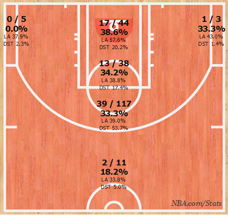 His shot chart through 11 games is stained blood red from every spot on the floor.