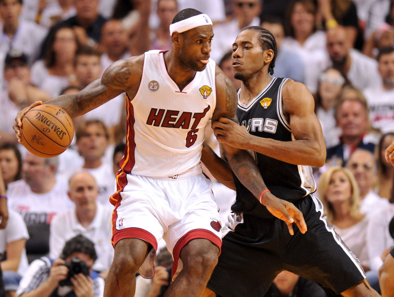 Miami became the sixth team in history to win back-to-back titles when the Heat edged the Spurs in seven games. San Antonio had won all four of its previous finals appearances. James finished with 37 points, 12 rebounds, and four assists in the 95-88 win in Game 7.