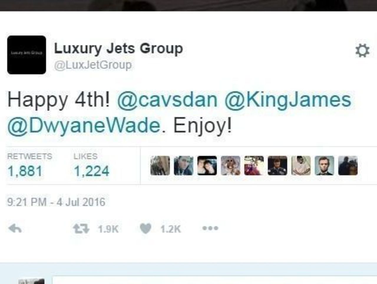 The year 2016 is a scene, man. Luxury Jets Group, a company that provides private aircraft to well-heeled clients, posted a tweet Monday including the handles of LeBron James, Dwyane Wade, and Cleveland Cavaliers owner Dan Gilbert.