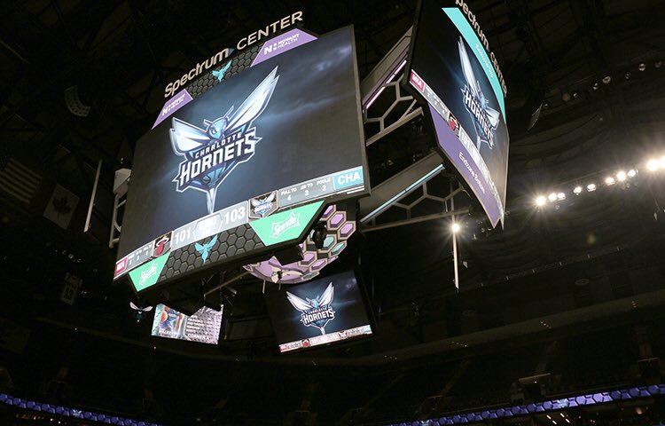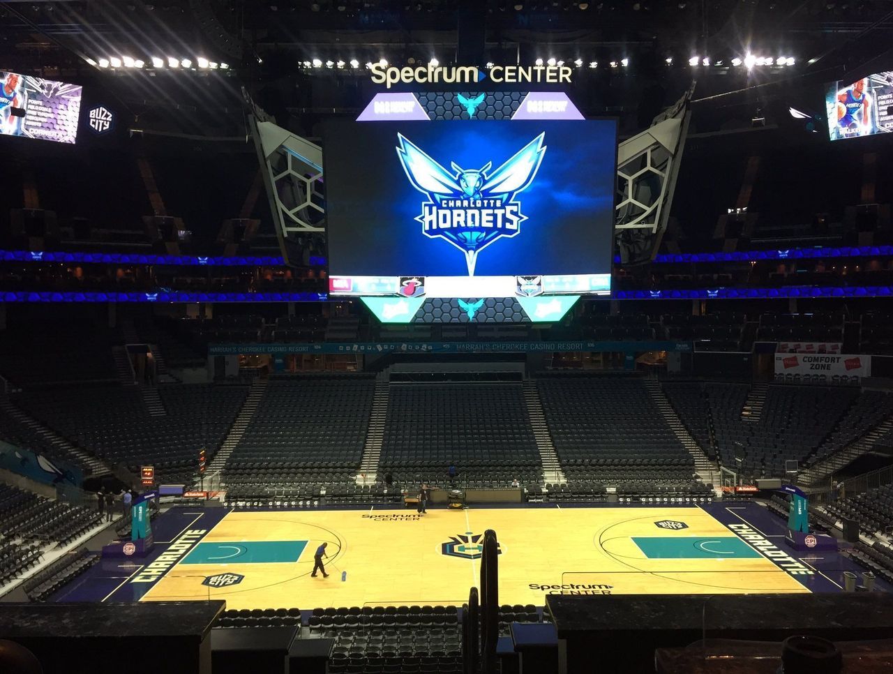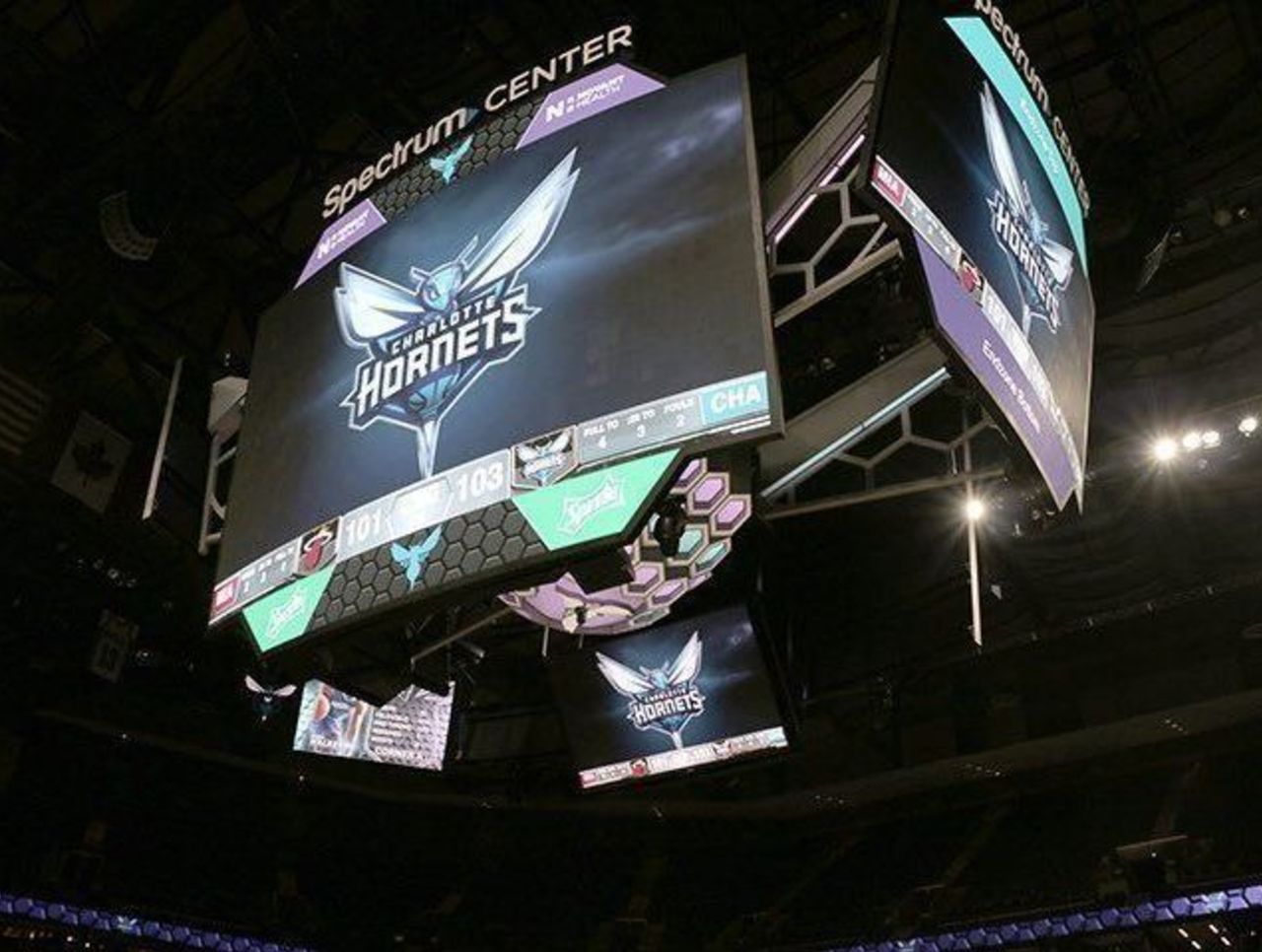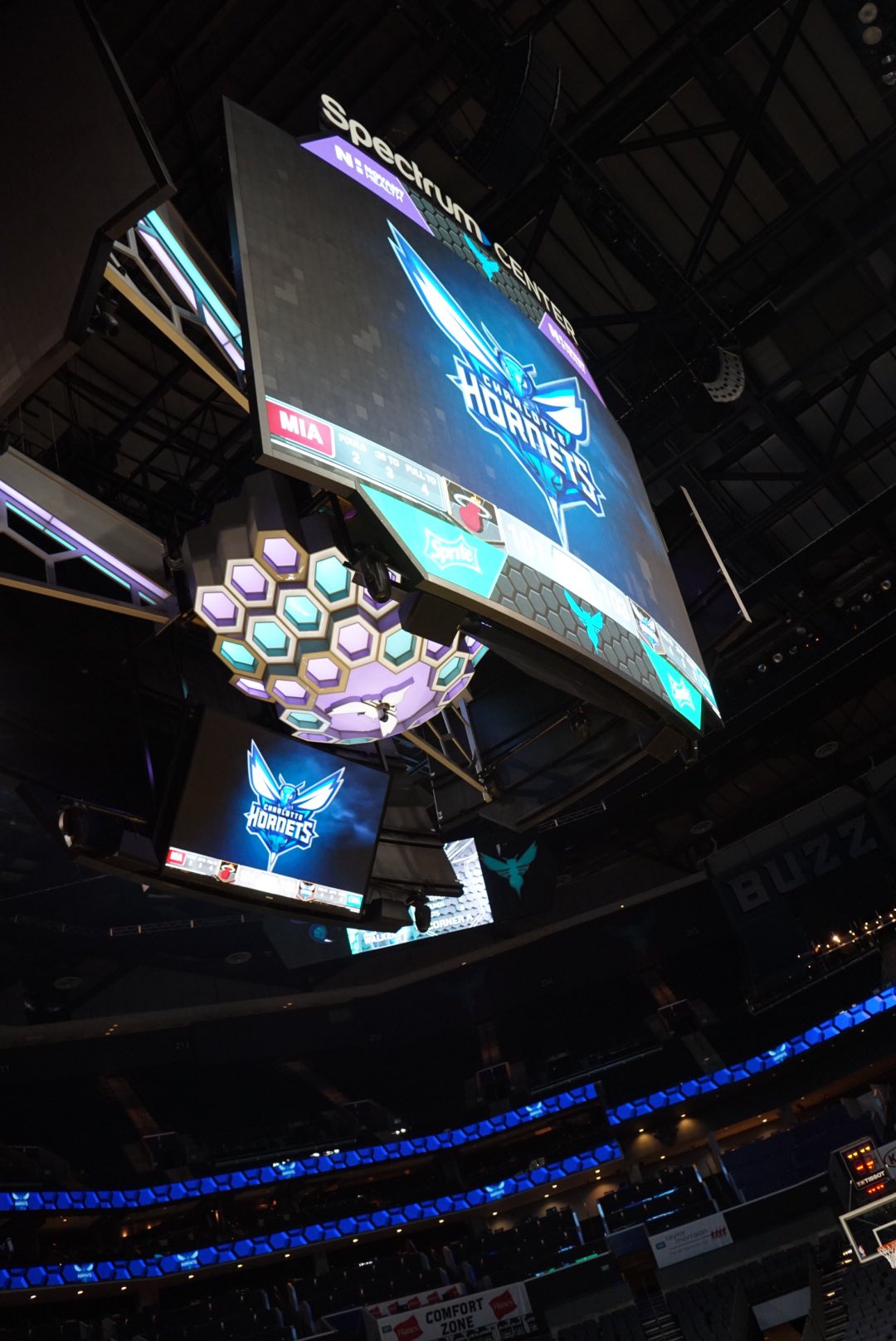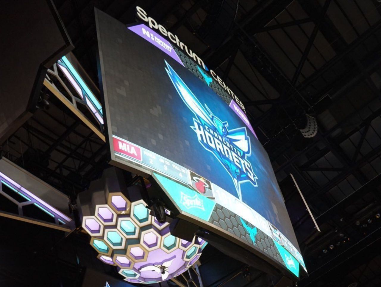 The recently renamed Spectrum Center now boasts one of the largest and highest-resolution scoreboards in the NBA above center court.