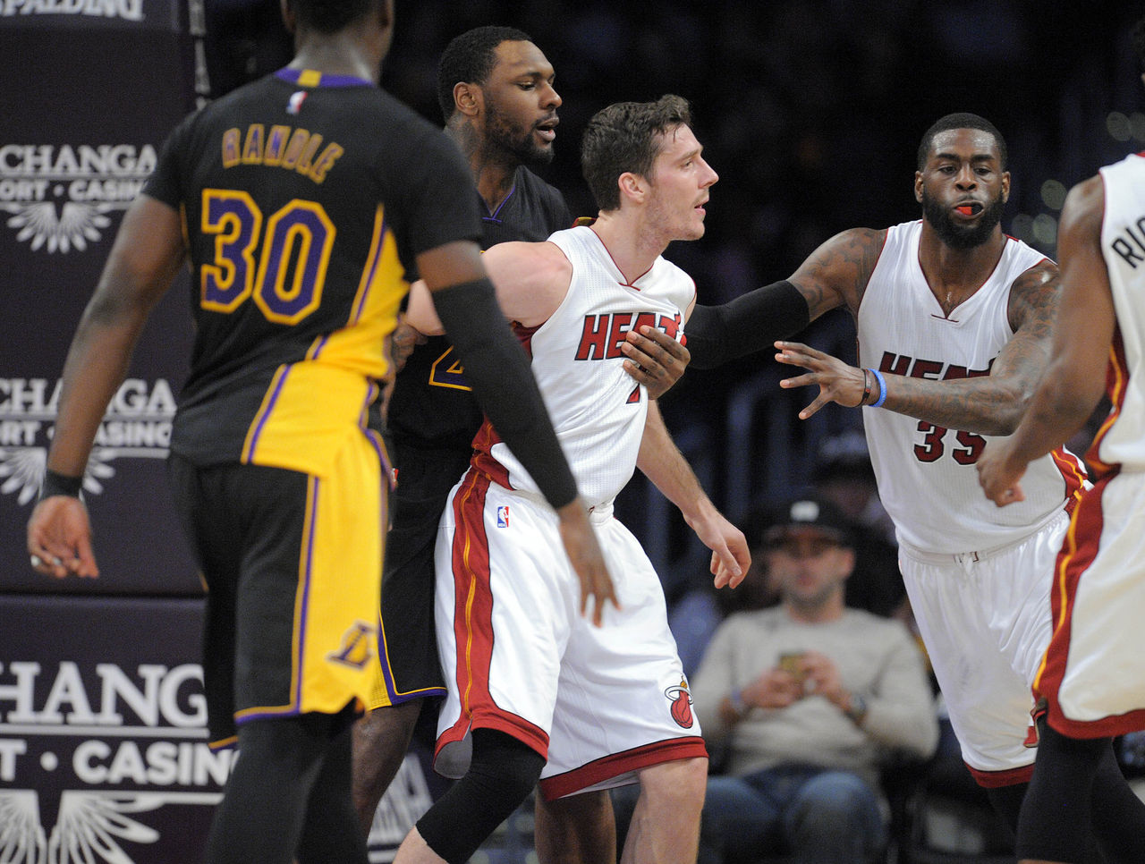 Heat guard Goran Dragic was shoved in the face by Lakers guard Jordan Clarkson following an exchange of shoves along the baseline during the third quarter. Dragic reacted to the cheap shot by getting up and charging towards Clarkson, but he was stopped before officials and teammates intervened.