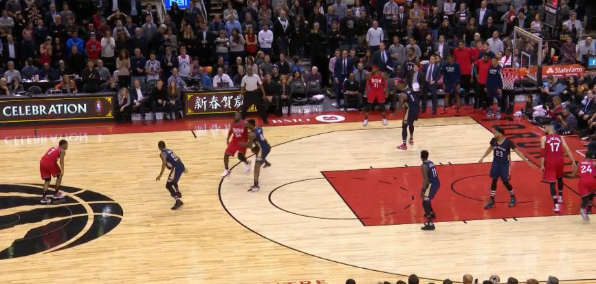The two Pelicans correctly anticipate Patterson eventually setting a high screen for Lowry. Rather than that future screen switching Lowry's defender from Moore to Jones (a big man), the Jones-Hill pre-switch now ensures Hill will get the chance to eventually switch onto Lowry, giving New Orleans a better perimeter defender.