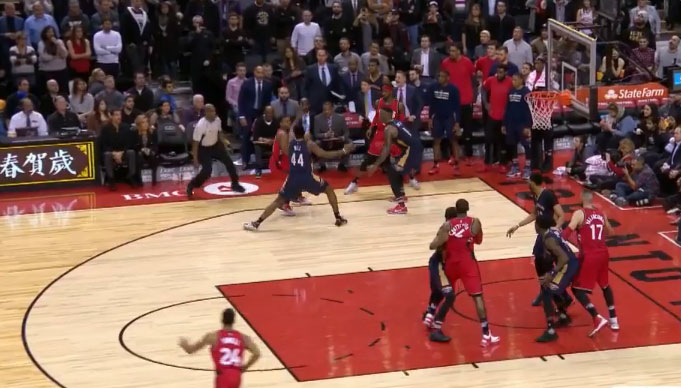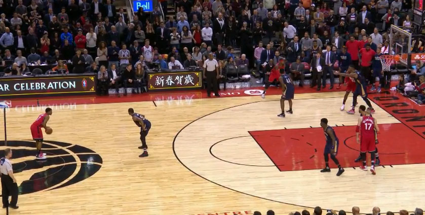 In the first screengrab below, you see Terrence Ross in the corner, motioning to Raptors teammate Patrick Patterson, while Terrence Jones - guarding Patterson - tries to get the attention of Pelicans teammate Solomon Hill, who's guarding Ross.