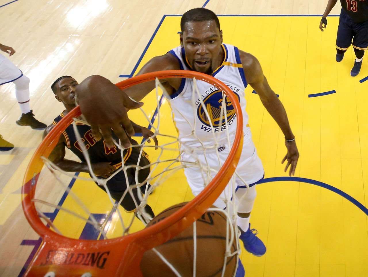 Twice bitten, in the third quarter the Cavs finally opted to wall off Durant's fast-break drive; J.R. Smith left Klay Thompson in the corner to get in the way. As Smith scurried over and a befuddled Kyrie Irving stunted towards Thompson, Durant instead dished to a suddenly wide-open Steph Curry behind the arc - swish. Maybe they should've just let KD dunk again.