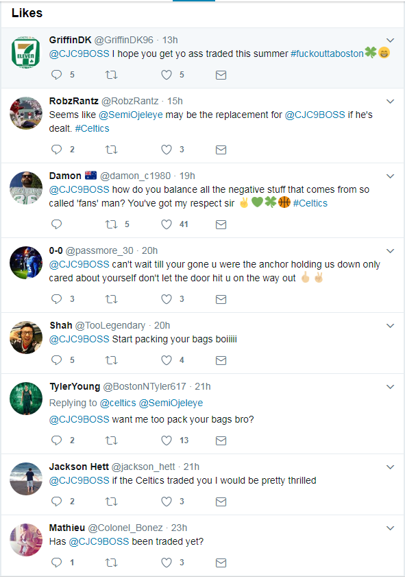 The 26-year-old forward liked a series of tweets addressed to him on Twitter hoping the Celtics ship him off in a trade.
