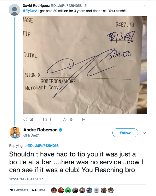 According to TMZ Sports, Roberson and 12 of his friends hit up Chupacabra Cantina in Austin, Texas, for drinks after he signed a new three-year, $30-million deal with the Thunder, racking up a $487.13 tab and leaving a $13.97 tip. Suffice to say, the waiter wasn't happy.