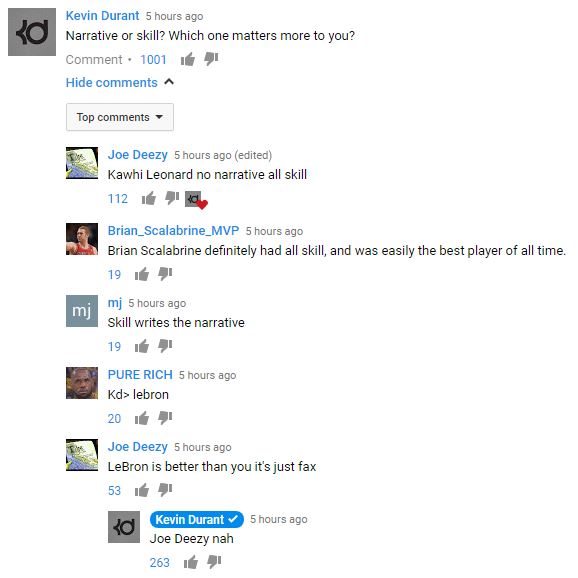 On Monday, someone went on Kevin Durant's YouTube channel to comment that James is better than him, to which the Golden State Warriors forward responded with a short and simple "nah."