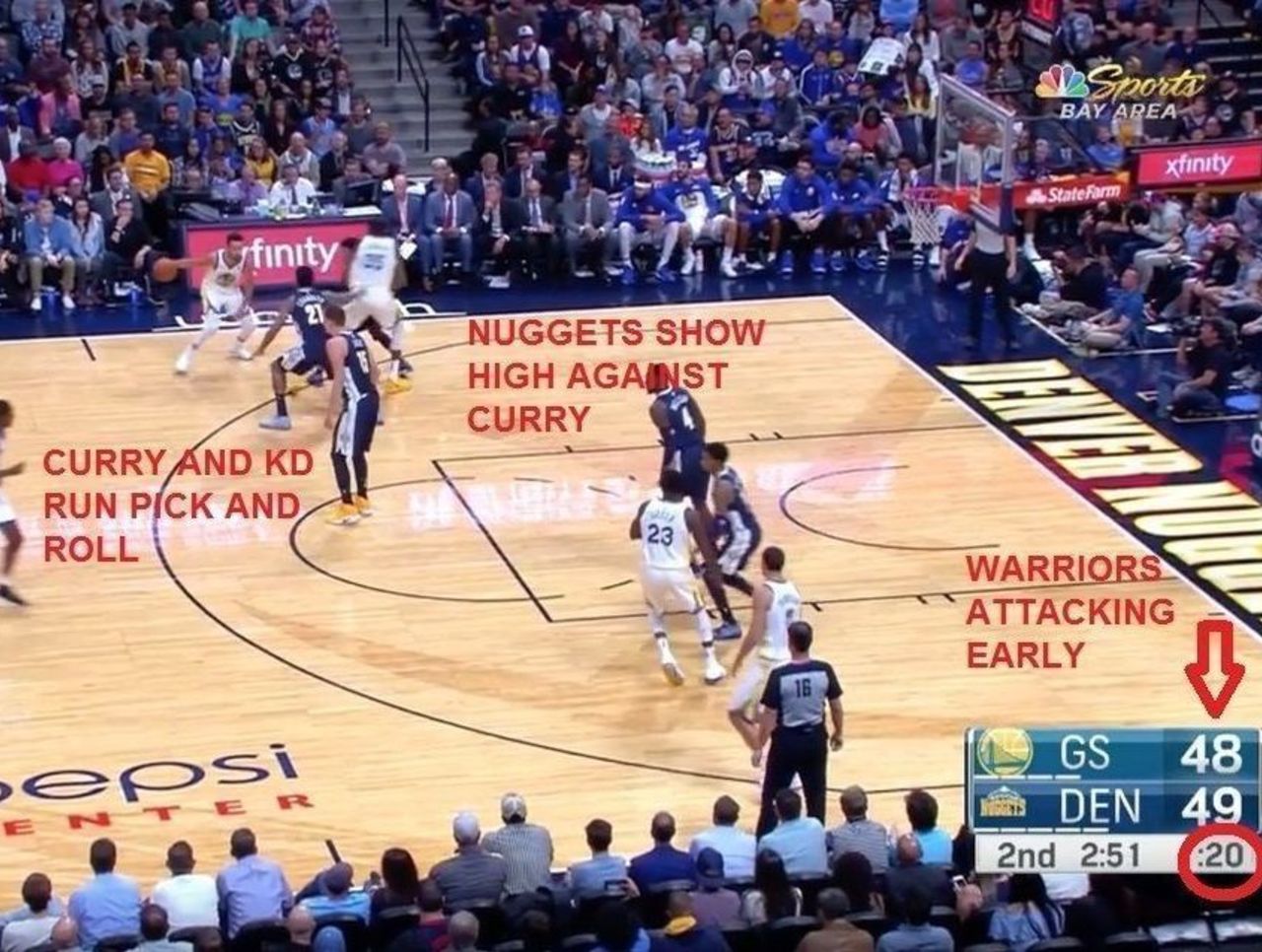 The Warriors start their offense with a high pick-and-roll between Stephen Curry and Kevin Durant, and they do so immediately. They're already setting the gears in motion with 20 seconds left on the shot clock, which forces the Nuggets to defend and keep their focus for longer.