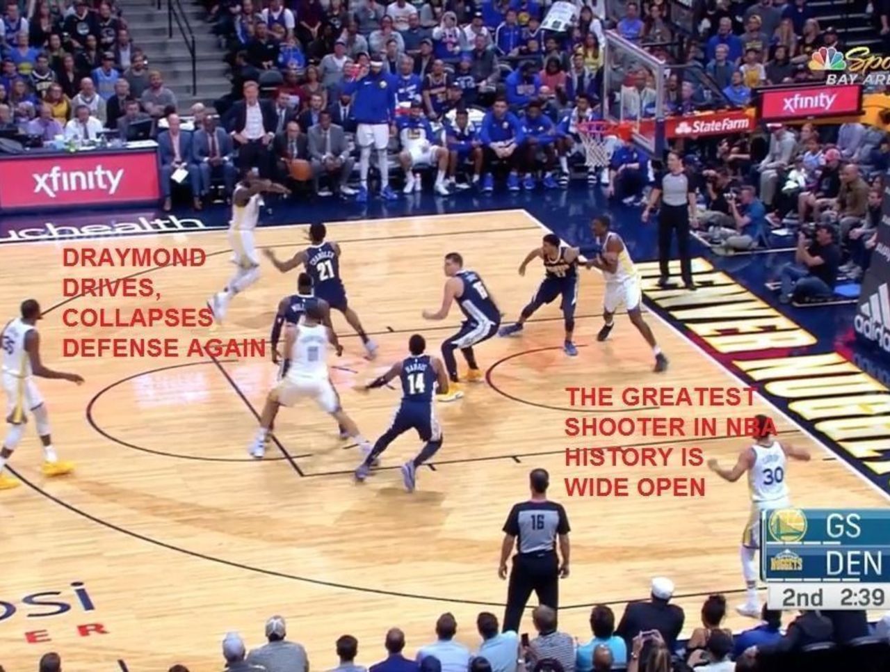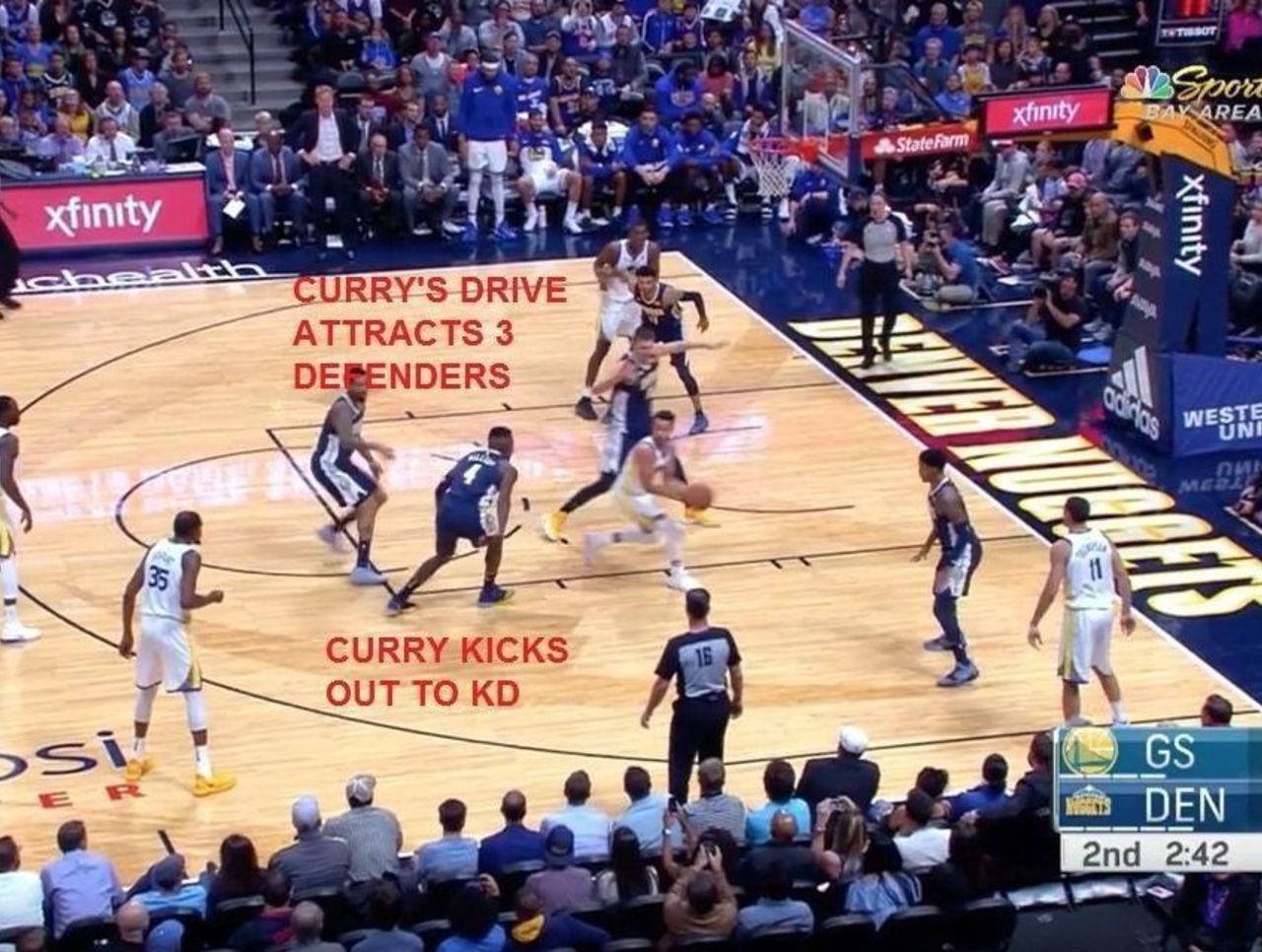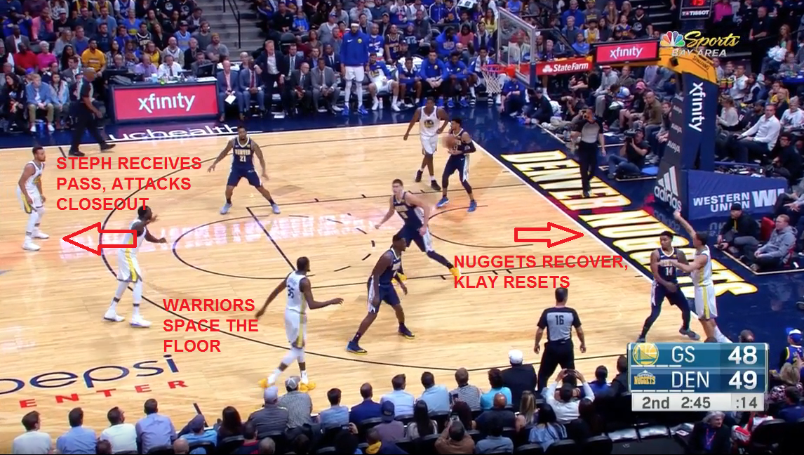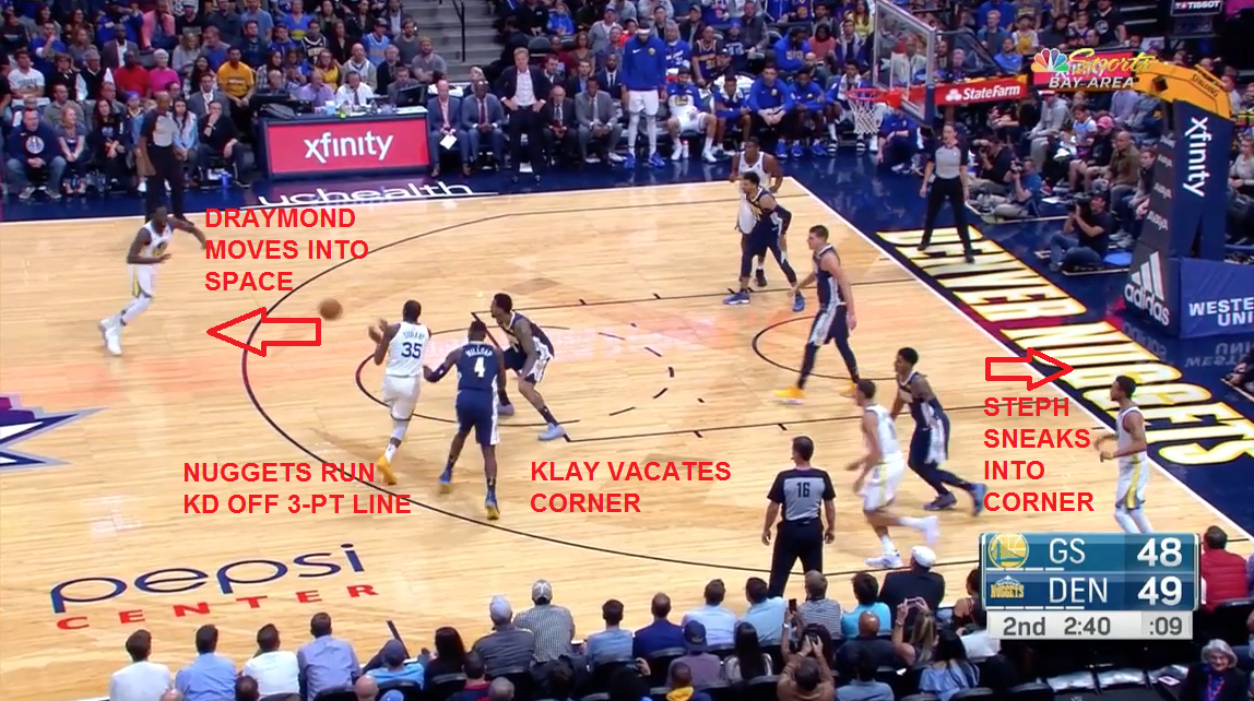 This is where the Nuggets are beat. They're completely scrambled by this bit of dribble penetration and there are shooters everywhere. Curry sets everything in motion with a bounce pass to Durant.