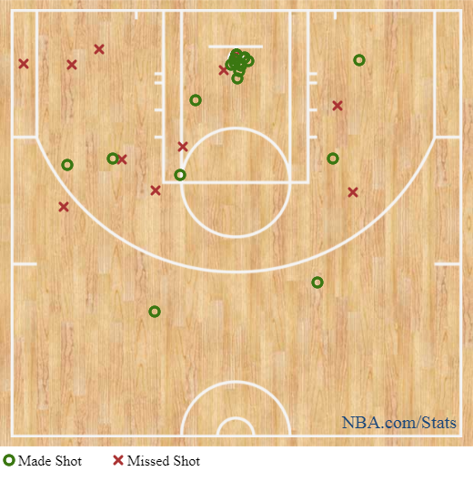 He also grabbed 11 rebounds, dished out seven assists, stole the ball three times, and blocked two shots. The only other time a player has posted a 57-11-7 line since 1984 came last season when Oklahoma City Thunder guard Russell Westbrook had 57-13-11 against the Orlando Magic in March.