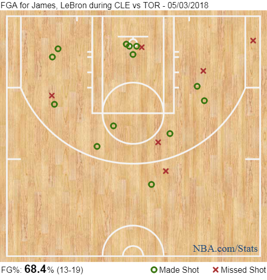 James took 19 shots in the second half, converting 13 of them for 27 points. He hit seven fadeaway jumpers, tying the most makes on that type of shot in the postseason in the last 15 years.
