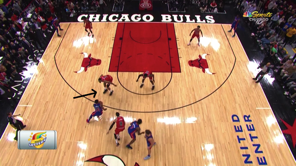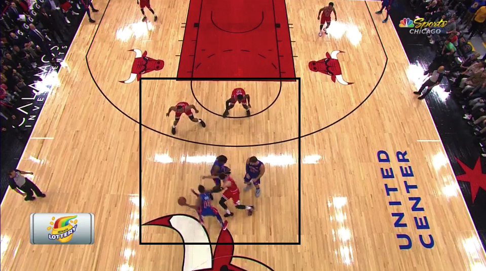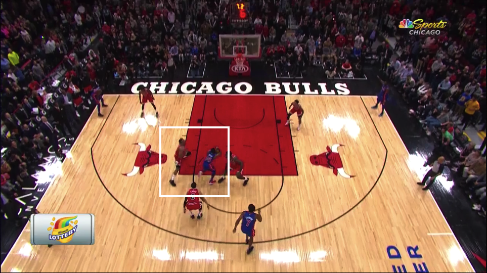 Let's break the play down in further detail. First off, the Pistons brought their two bigs up for a double screen in hopes of clearing the paint, and the Bulls played right into their hands. Parker and Bobby Portis are both well above the free-throw line when Smith starts his drive.