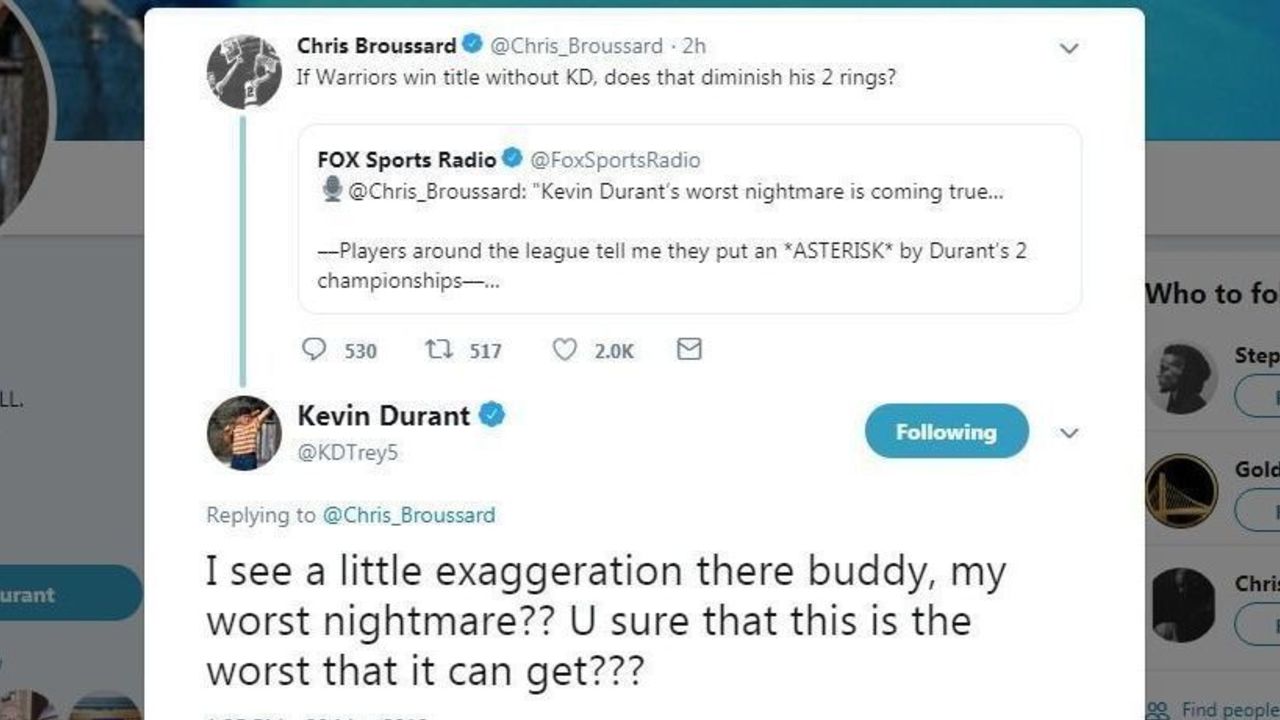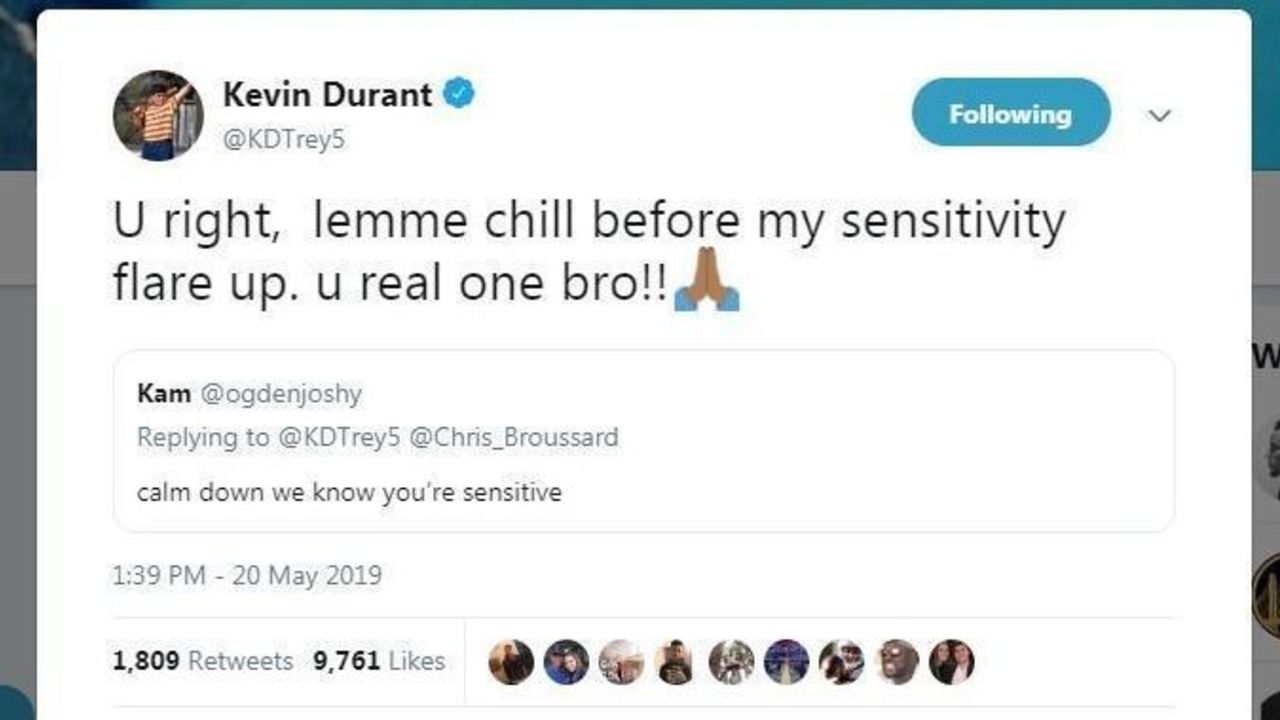 It's been a while since Kevin Durant engaged with critics on Twitter, but that seemed to change on Monday when his account took issue with a take from FOX Sports' Chris Broussard.