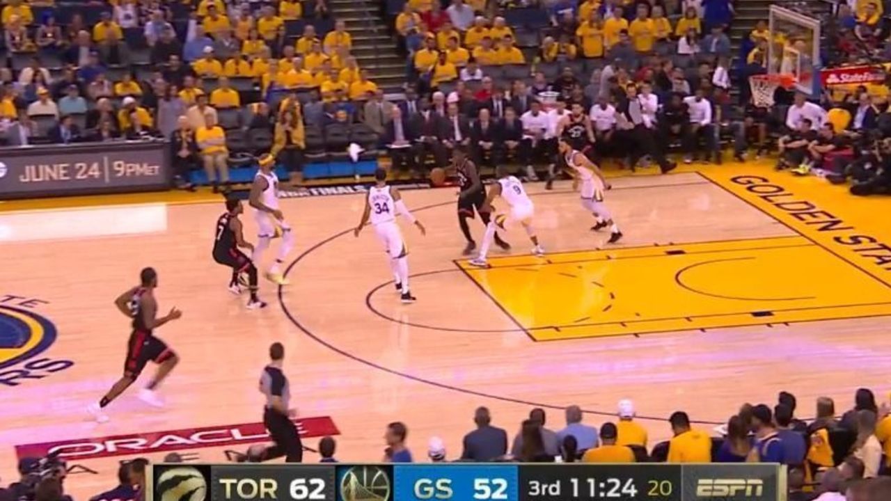 The Warriors kept making the same vexing mistakes, like allowing open looks by overhelping in the middle of the floor. Watch Cousins inexplicably abandon Gasol to double Siakam up high, allowing Gasol to cut for an easy bucket. Then watch Draymond help down on a Siakam drive from the corner that wasn't particularly dangerous - just to try for a no-chance strip - conceding a Lowry three in the process: