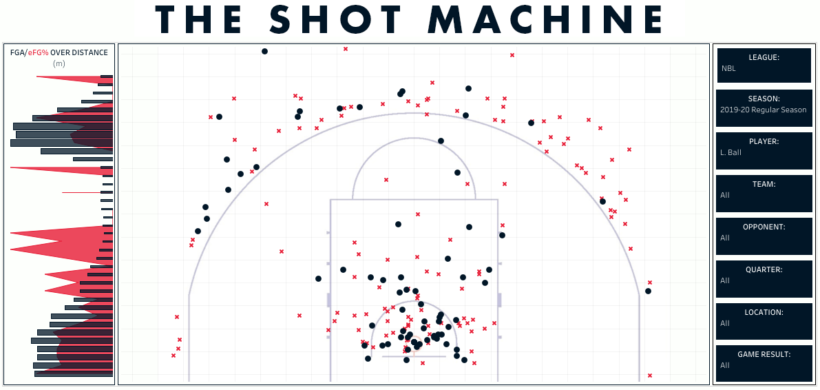 The knocks on Ball's game surface when he doesn't have the ball, either because he's defending or he just clanked a shot attempt. He can hit 20-foot floaters and the occasional pull-up from Steph Curry range, but the wonky look of his jumper - his low, pushy release; the susceptibility to drift off-balance - hardly allays concerns about his efficiency and shot selection. His NBL splits ranged from below average to dire: 51.2% at the rim, 33.3% from midrange, and 24.4% behind the arc, as visualized by this chart from the NBL analytics website SpatialJam.