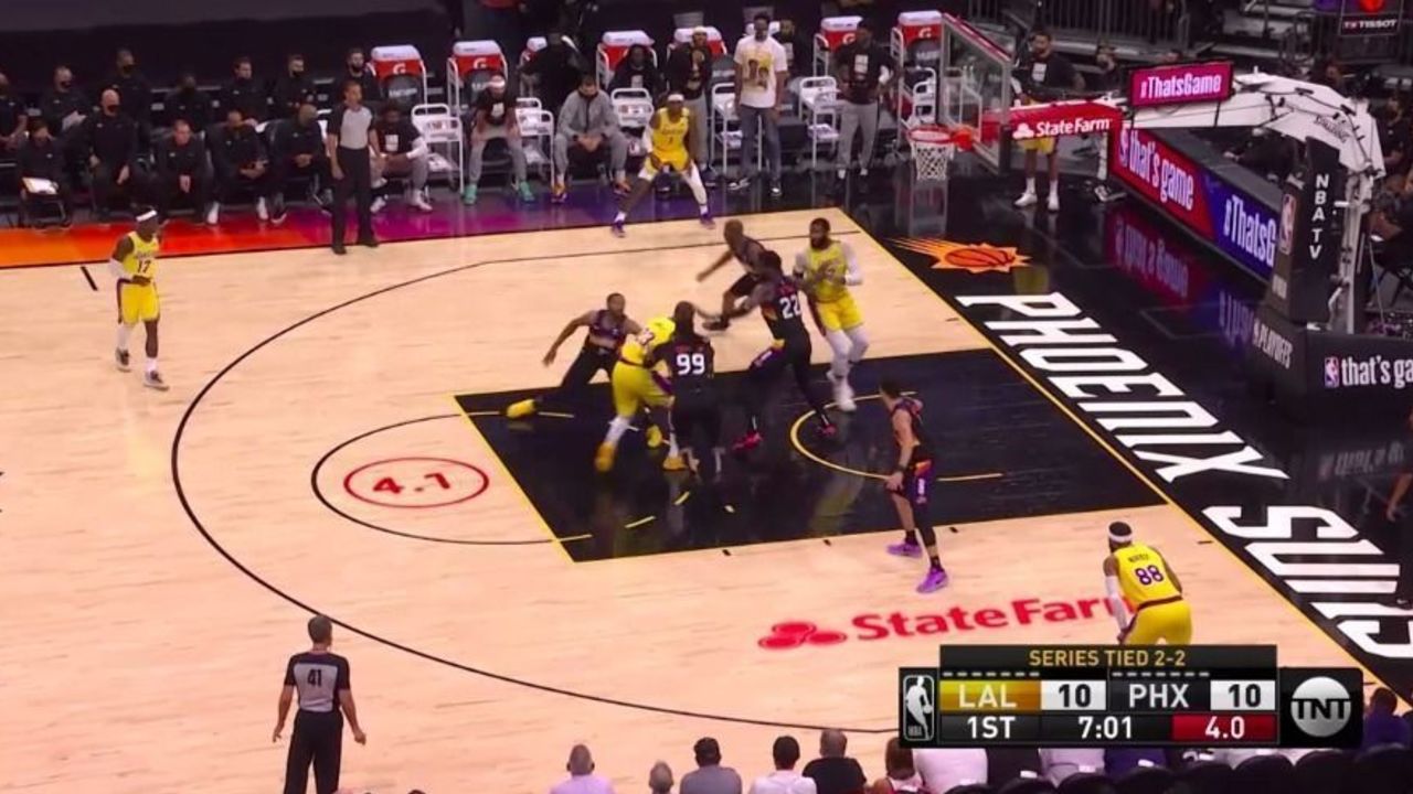 All five Suns defenders had at least one foot in the paint, and the Lakers couldn't find their way to an advantage. L.A. has the strong-side corner empty, but that served no purpose because LeBron rolled into a post seal in the middle, where the Suns were collapsing and where Dennis Schroder couldn't thread him the ball. Schroder, who had a nightmarish game, also passed up the opportunity to reverse the ball or skip it to the corner, which would've at least forced long closeouts from Chris Paul and Devin Booker. Instead, he dithered with the ball before driving into the sea of bodies and attempting a contested floater: