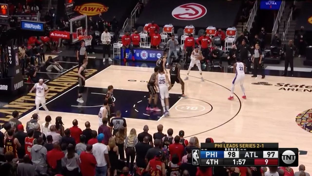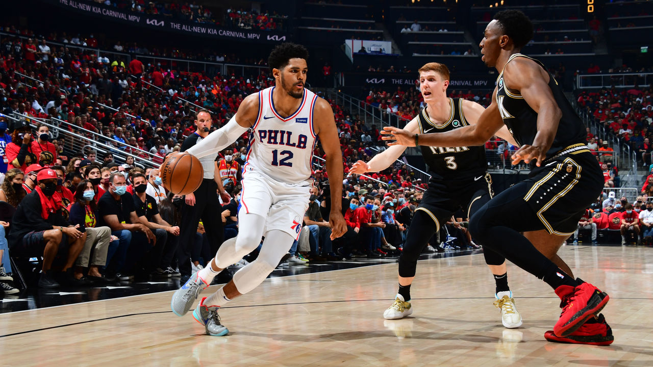 The image below is a perfect example of Harris' tendency to defer and was a regular occurrence in crunch time Monday. After coming off screens from Simmons and Embiid, Harris got the ball from Embiid with a bit of runway to attack Bogdan Bogdanovic. Yet instead of forcing the action and putting pressure on the Hawks' defense, Harris immediately looked back to an ice-cold Embiid, who had space on the perimeter against a sagging Clint Capela: