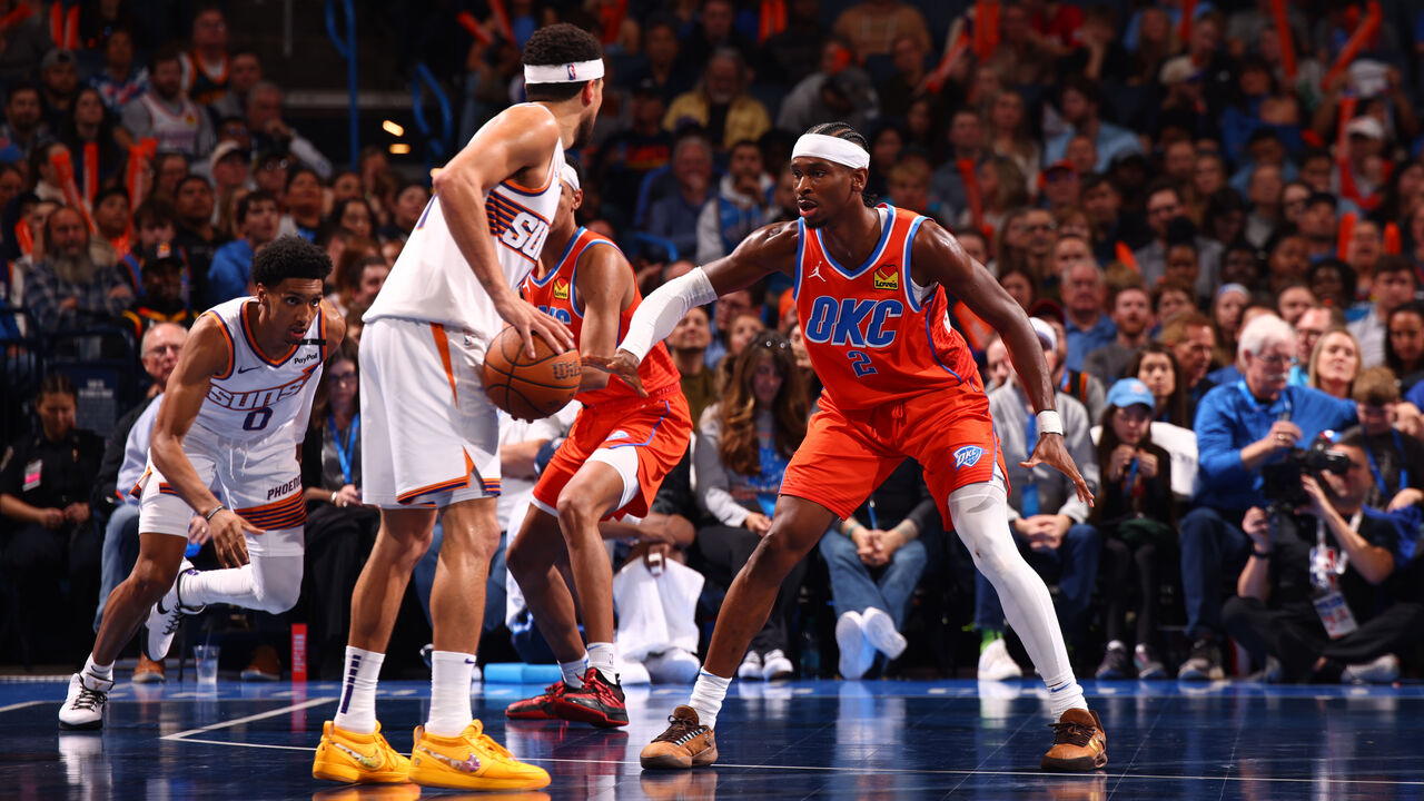 At the defensive end, they play a hyper-aggressive style that leverages their army of quick, strong, rangy, handsy wings. They have eight rotation players averaging at least 1.5 steals per 36 minutes, and their 12.1 steals per game as a team rank third all time. Mark Daigneault has them executing shape-shifting schemes and fluid principles that funnel the ball from stars to shaky decision-makers more liable to panic and make mistakes. Whether they're picking up full court, blitzing pick-and-rolls, converging on roll men with multiple taggers, digging down on drives from the strong side, or playing a pressure zone, they always keep opposing offenses guessing.