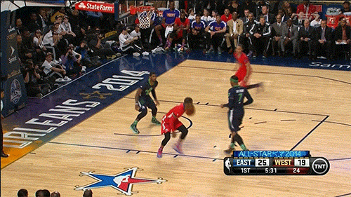 And he's putting on an incredible show early in Sunday's All-Star Game, scoring 18 points in the first nine minutes of the game on 9-of-11 shooting and, get this, seven of his baskets have been dunks. Here's one, a windmill after a nice dish from teammate Chris Paul: