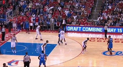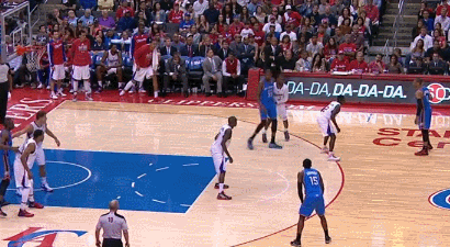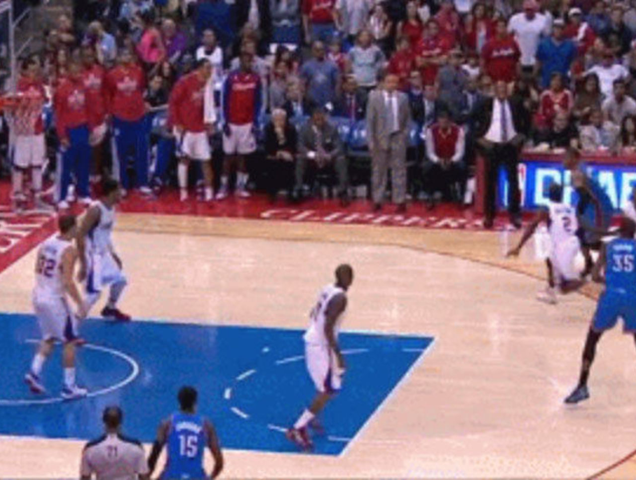 Here's another example. The Thunder are all just kind of standing around, Durant wants the ball around the right elbow for some reason instead of bodying Paul deeper, Westbrook obliges, Blake Griffin times his help perfectly and Durant throws the ball away with nowhere to go: