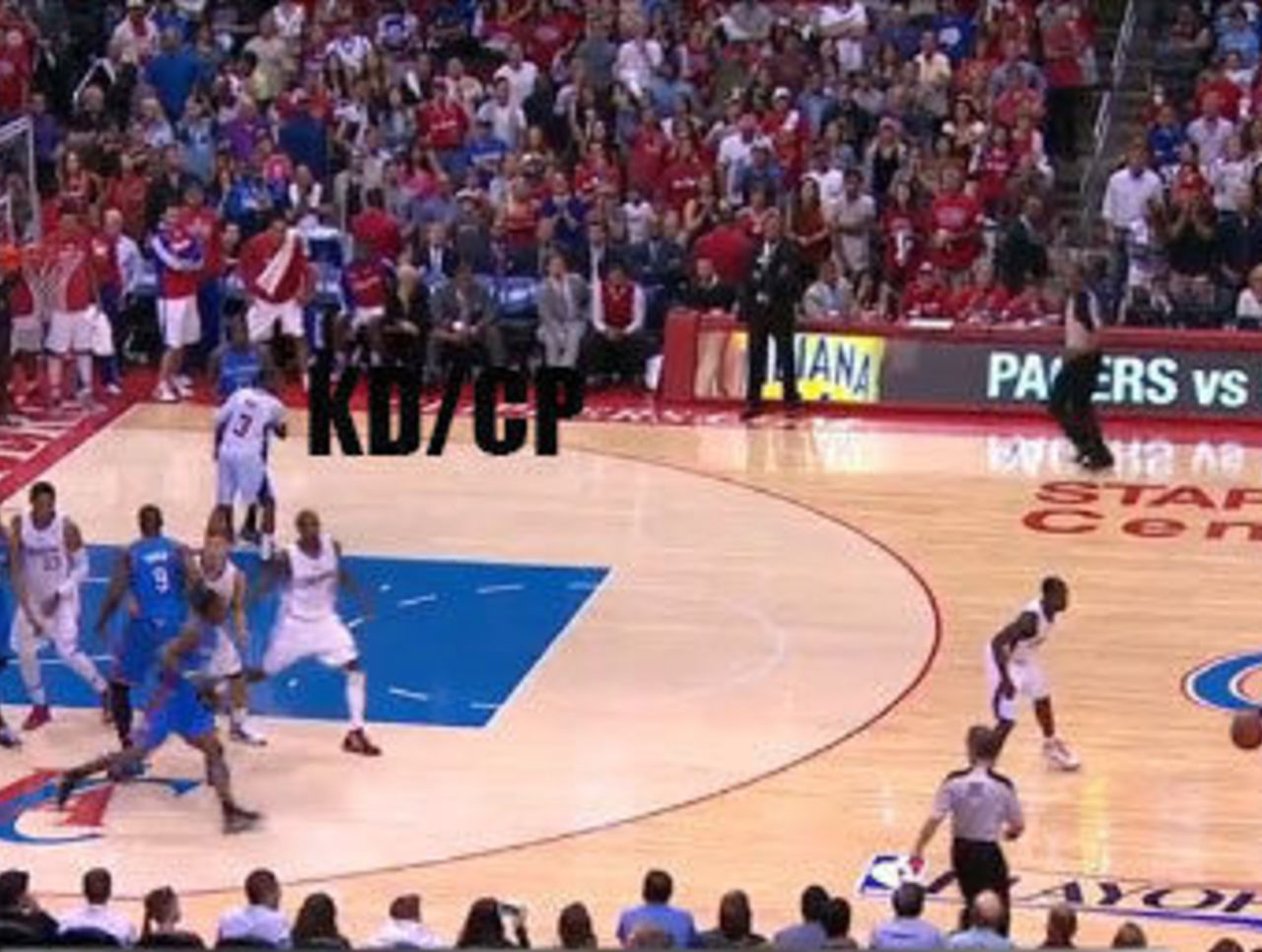 In our last example below, instead of the bigger Durant forcing Paul into the spot KD wants to be in, Paul somehow pushes Durant out to nearly the perimeter. Again faced with an aggressive double-team and his stagnant teammates all on the other side of the floor, Durant commits a turnover that leads to a Darren Collison bucket and the Clippers cutting the deficit to one: