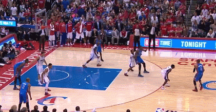 In the play below, Westbrook takes too long to give KD the ball after the Durant screen. Instead, by the time Russ goes through the legs and flips the ball to Durant, Jamal Crawford has already rotated to help on Durant. Paul also recovers back to Durant, and the resulting double-team leads to an awkward off balance shot: