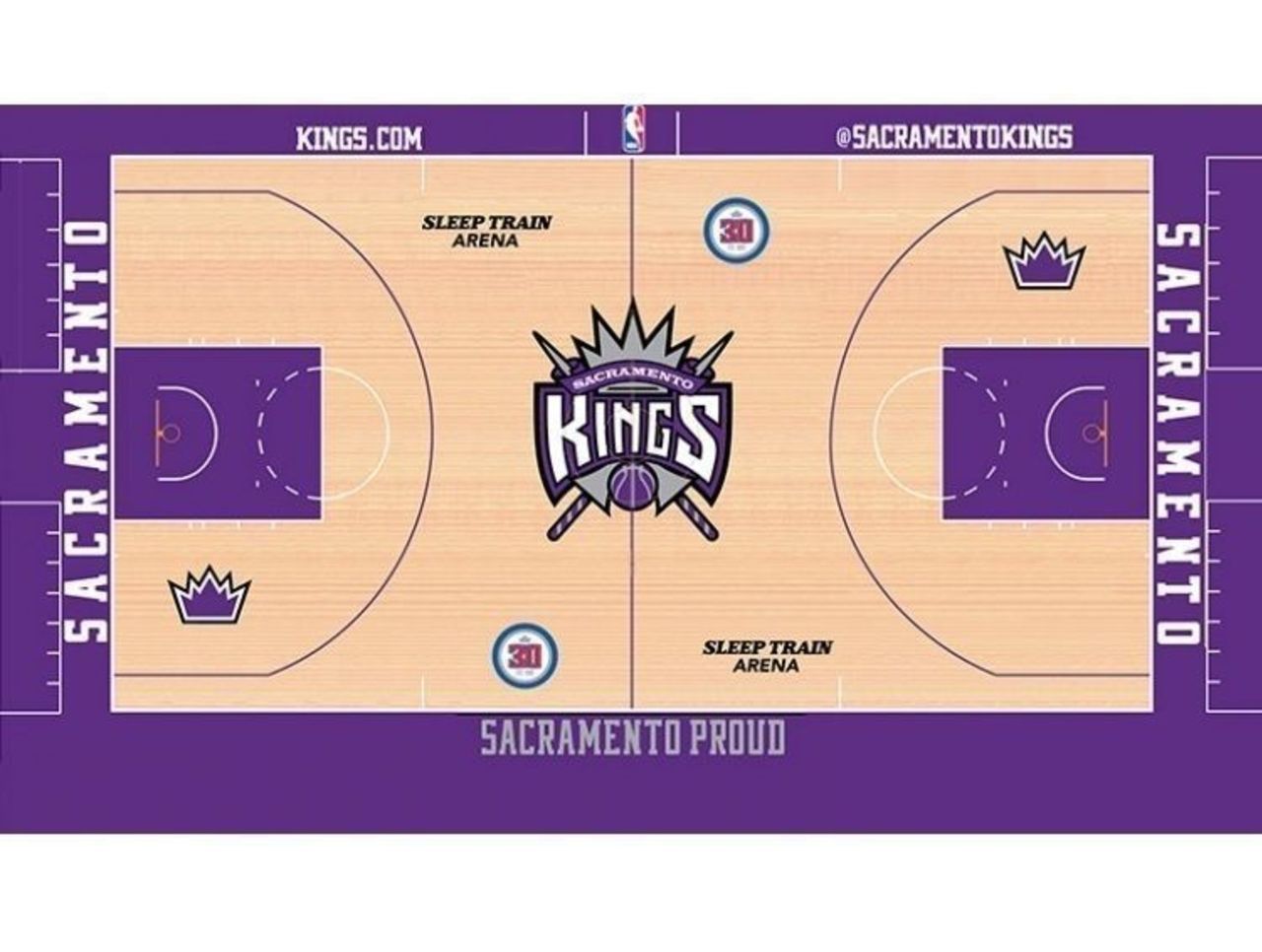 Now, add the Sacramento Kings to that list. Their new design (see below) has a 32-foot "Sacramento Proud" insignia, a pair of crowns, and a whole lot of purple.