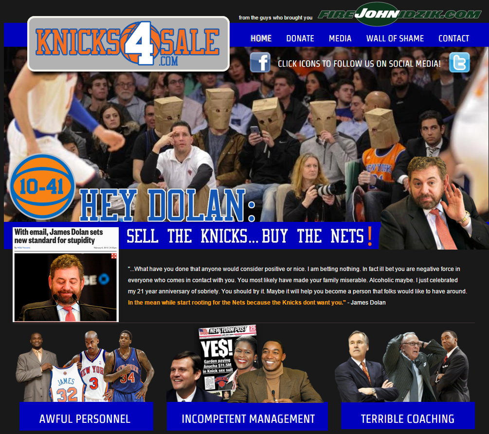 Dolan's offensive email in response to a disgruntled fan is the impetus for the website, which hopes to raise enough money in donations to put up a billboard near Madison Square Garden. The website urges Dolan to sell the New York Knicks and buy the Brooklyn Nets, hoping to transplant the franchise's awful personnel, incompetent management and terrible coaching to another borough.
