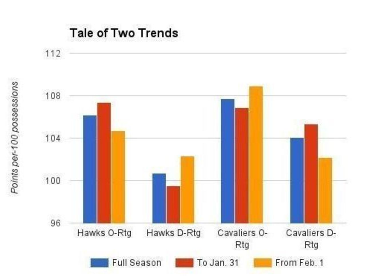 The 82-game results don't necessarily reflect the current iteration of each team (ask the Toronto Raptors), and the Hawks declined on both ends late in the year while the Cavs surged. Love's injury confuses Cleveland's side of this some, but it's clear the Hawks weren't quite functioning at full capacity by the time April rolled around.