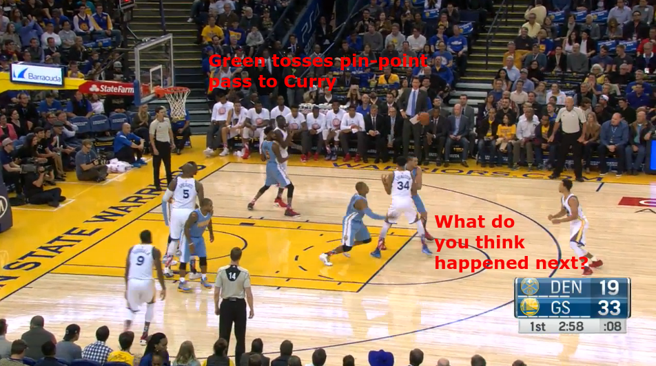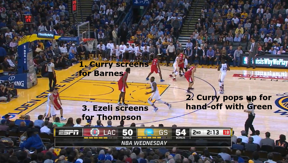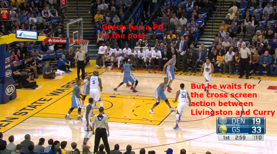 When he's at the high post extended, Green is able to open up the paint by dragging another big with him. At that point, he has two options. He can either find spot-up shooters flying around screens along the perimeter, or he can set up the deadly handoff to Curry.