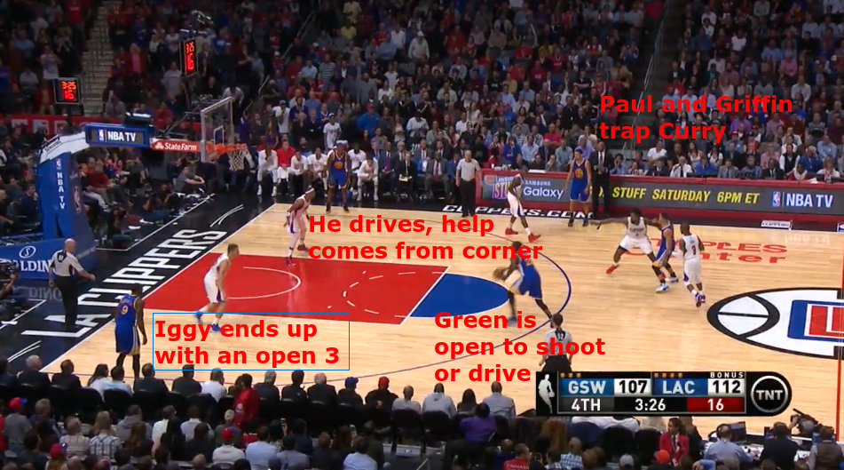 That's the play that doomed the Los Angeles Clippers when Golden State erased a 23-point deficit last Thursday. Notice the two drive-and-dish connections between Green and Iguodala.