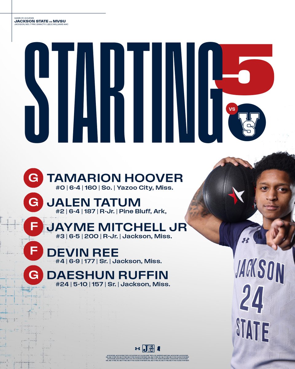 Jackson State Men's Basketball@GoJSUTigersMBBTonight's starters #TheeILove | #BleedTheeBlue2 months ago•