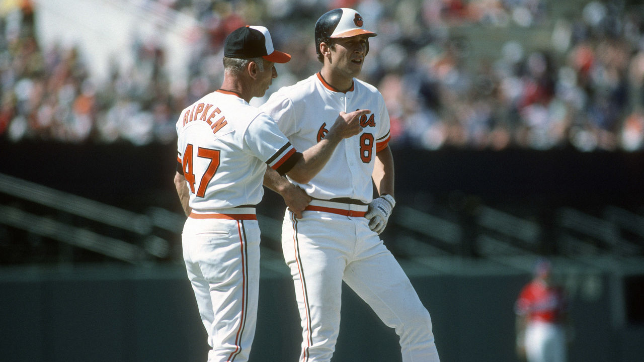 Take a long, hard look at this picture and try to find anything wrong with what the Ripkens are wearing. Tri-color hats and helmets, matching stripes on the sleeves and waist, and a pair of perfect fonts to display logos and names. The cartoon bird is perhaps the pinnacle of a design era where team logos were more likely to smile at you than sneer. The O's nailed this one.