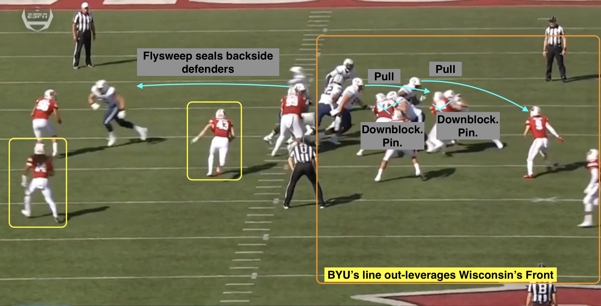 The jet motion flew across the formation, sealing the backside linebacker and a spinning safety. The frontside of BYU's line down-blocked Wisconsin's defensive linemen, pinning them towards the middle of the field. A pair of backside linemen wrapped around, helping out-leverage a Wisconsin front that was left flat-footed.