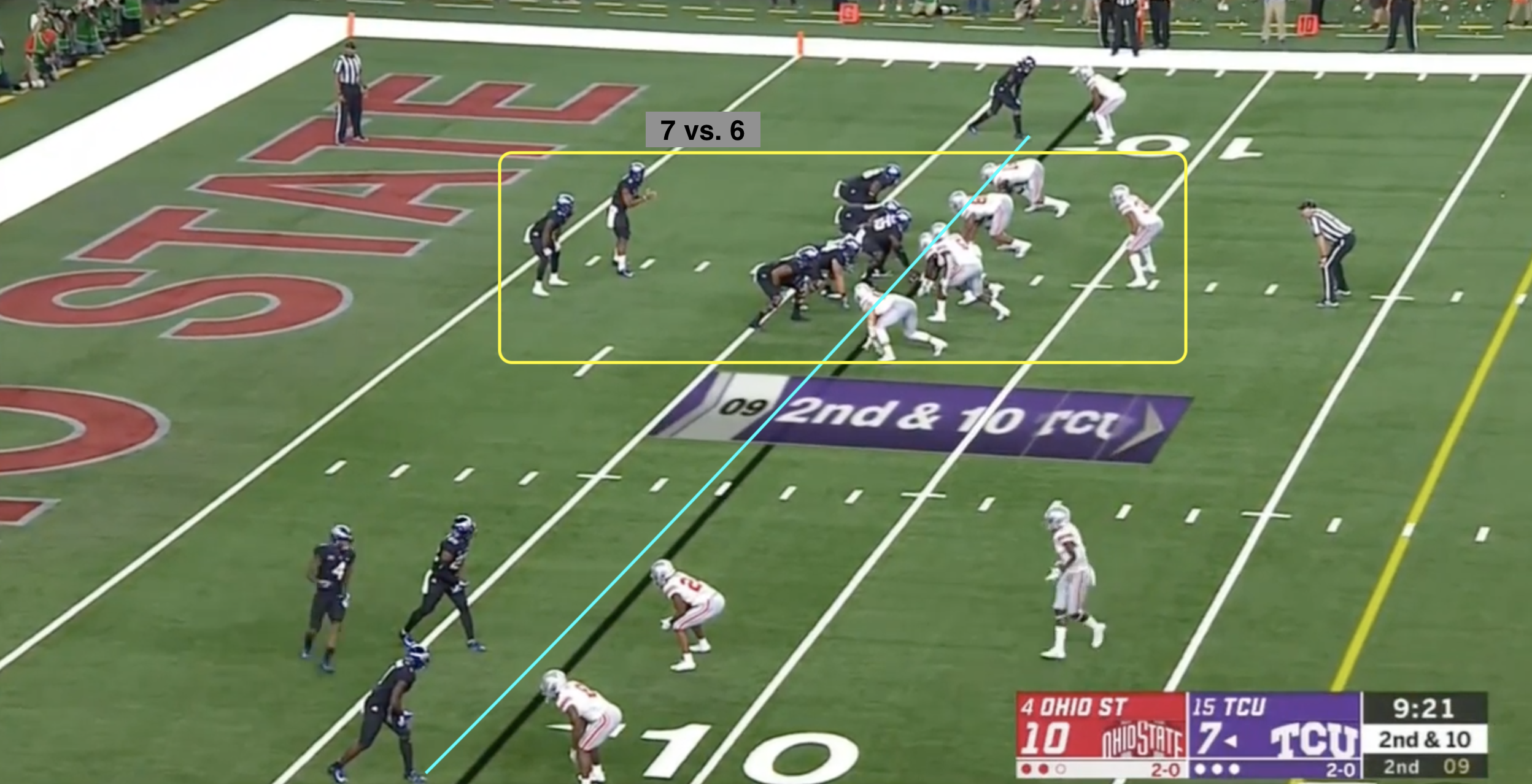 When you add the threat of the quarterback run, TCU had seven players in the box matched up to the Buckeyes' six, including a hybrid linebacker, better suited to chase players around in coverage.