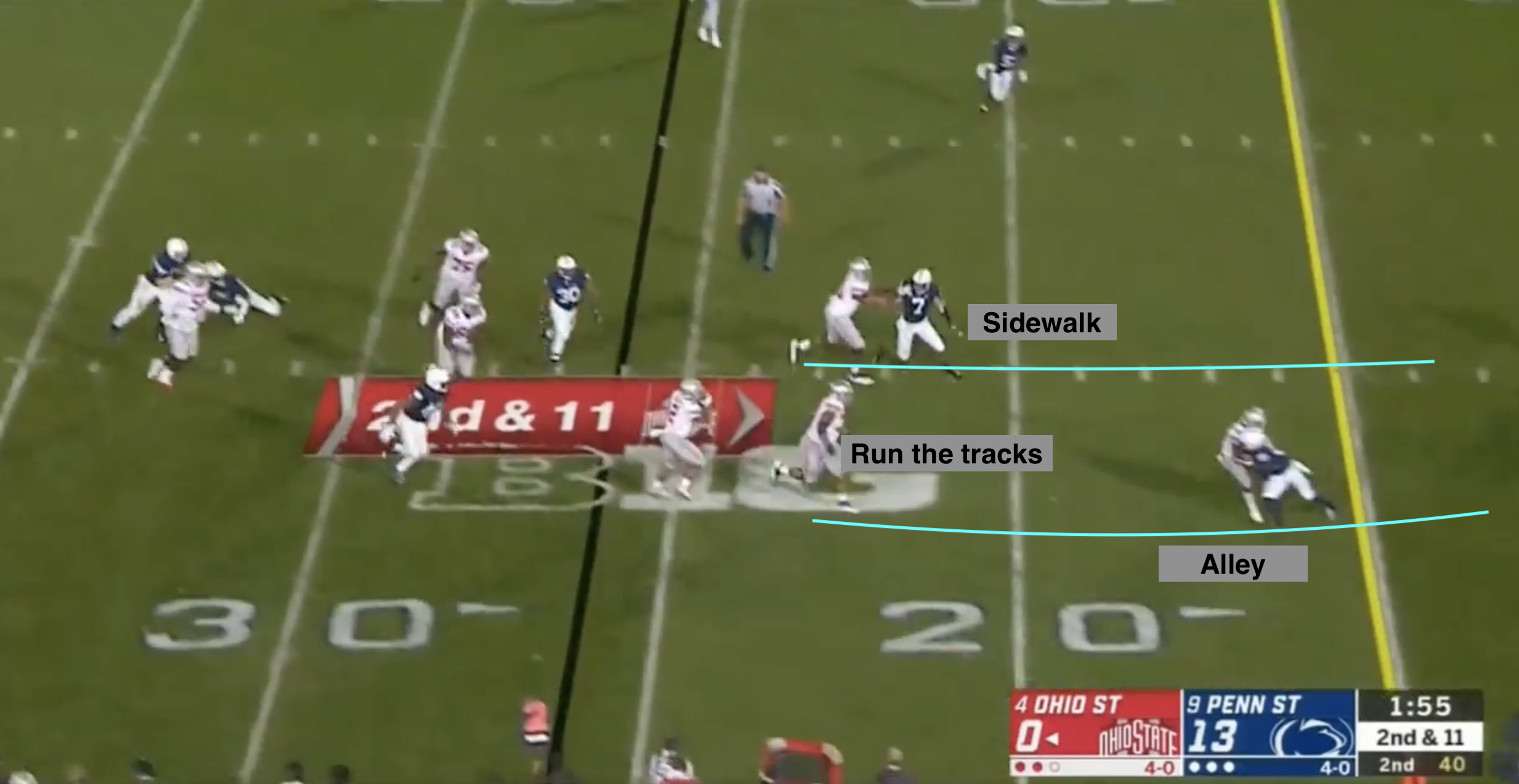 At the last second, the Buckeyes countered with some shuffling of their own, moving all three defenders to maintain the balance of the formation. That wreaked havoc on the blocking mechanics for the play, a basic inside-zone read. Young was left unblocked as he careened in off the edge.