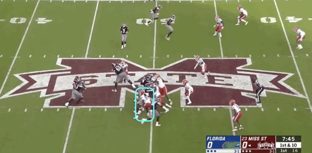 Florida countered by switching up its gaps and stunting its outside defenders inside. Polite’s flexibility helped there, too. He’s able to get low to the ground, swooping behind his defensive tackle. It’s awfully hard to pick up, even more difficult to block: