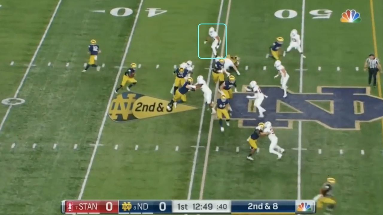 His mobility helps in the run game, too. He’s a talented enough athlete to keep all the Irish’s move concepts and options on the table. Every kind of boot-action litters their playbook. Like a classic zone read, the backside defender is forced to sit-down, turning the run game into a 10-on-10 matchup, rather than 11-on-10: