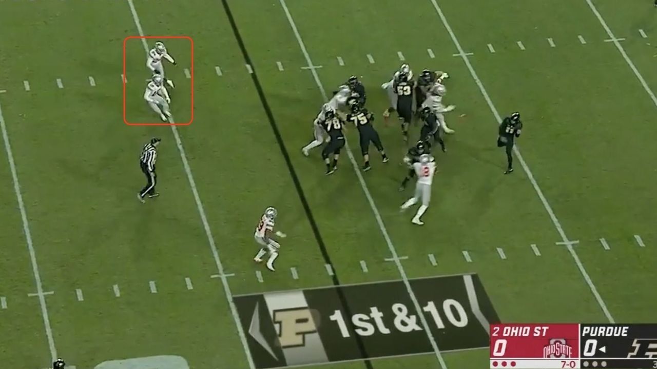 Purdue isolated the remaining linebacker, Malik Harrison, by running two in-breaking routes. Harrison had to pick his poison - either cover the first route (allowing the second receiver to streak into space) or pass the first guy off and give up inside leverage, forcing the safety to jet laterally across the field in coverage.