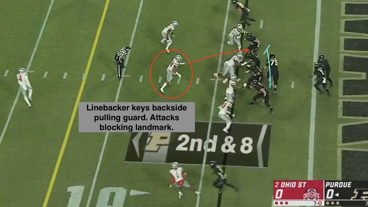 However, OSU’s linebackers consistently bit on play fakes with pulling lineman, as if they hadn’t seen what Brohm's been running for the last 18 months at Purdue. Linebackers constantly flew to the line of scrimmage, leaving way too much space behind them: