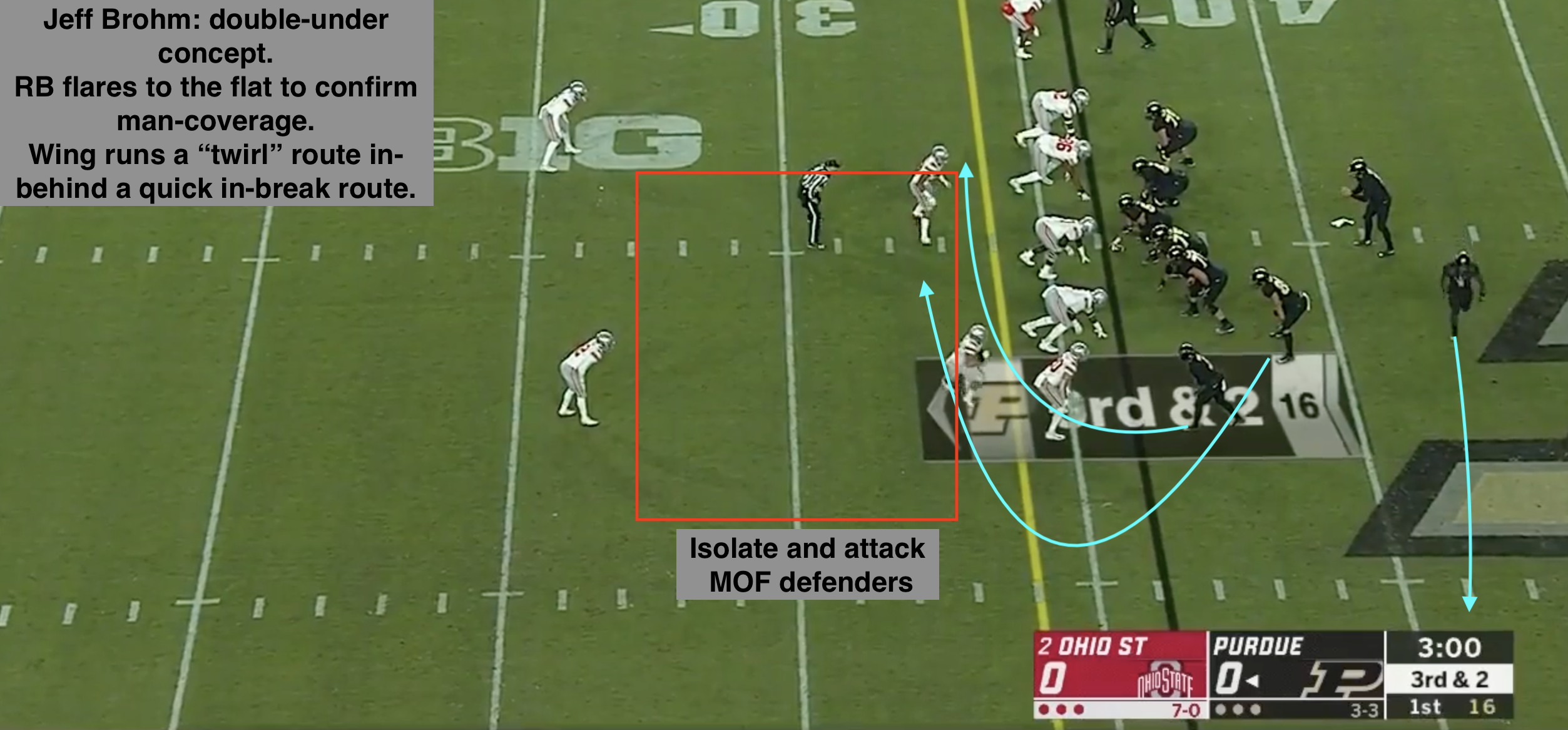 Brohm went out of his way to isolate and attack Ohio State’s linebackers in coverage. They couldn’t keep up. Purdue would sucker them in with some kind of action up front, before spinning the ball in behind:
