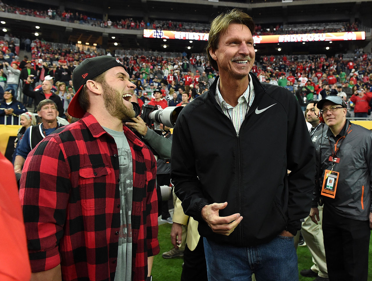 Sporting a backwards Buckeyes cap and an Ohio State colored shirt, Harper had a VIP view alongside the Hall of Fame pitcher as the reigning national champions squared off against Notre Dame.