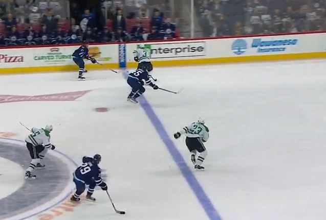 What's interesting to note here is that Patrik Nemeth (15) was on Laine's tail as a defenseman who's been forced to play forward as a result of a bevy of Dallas injuries up front.