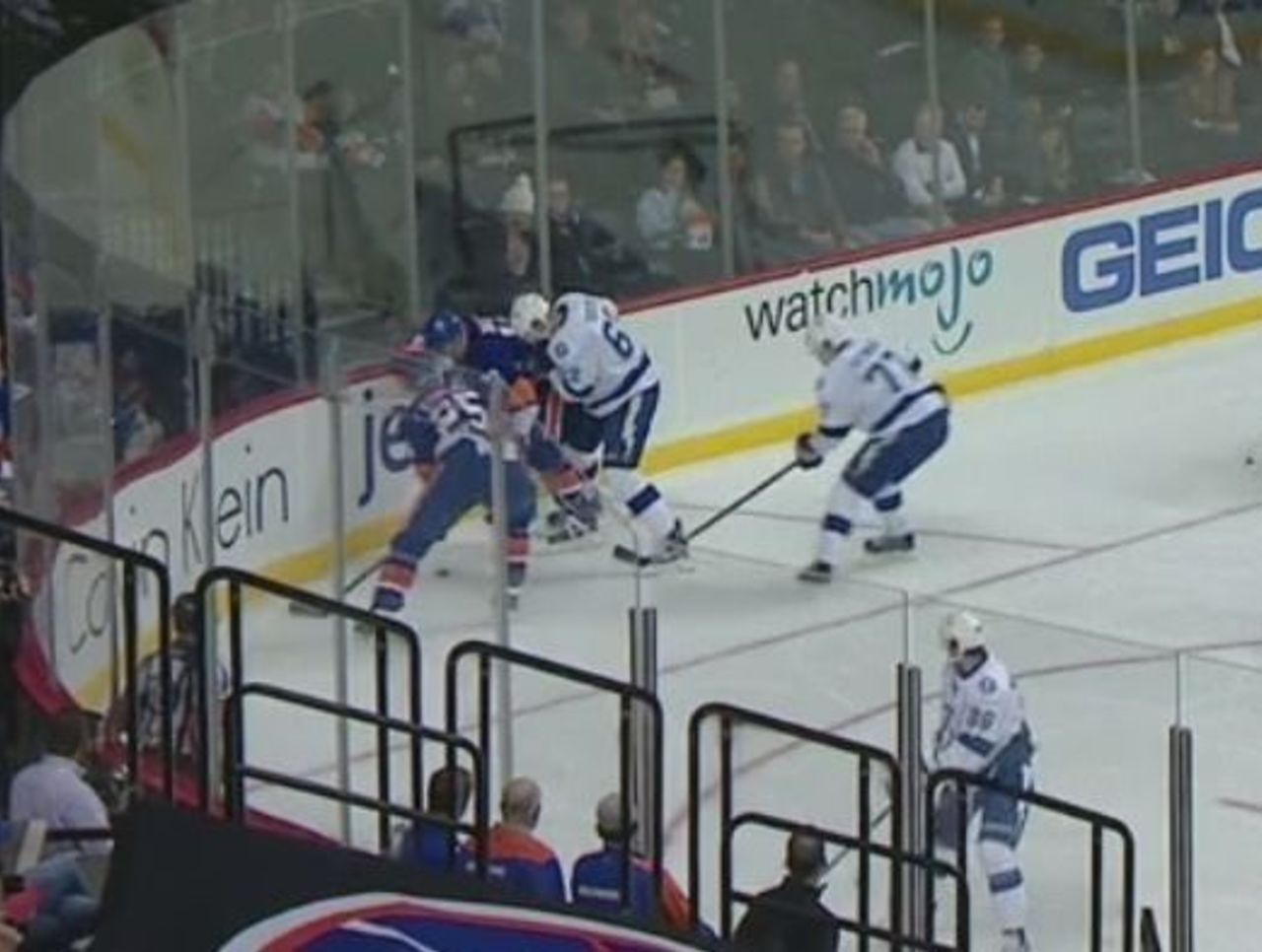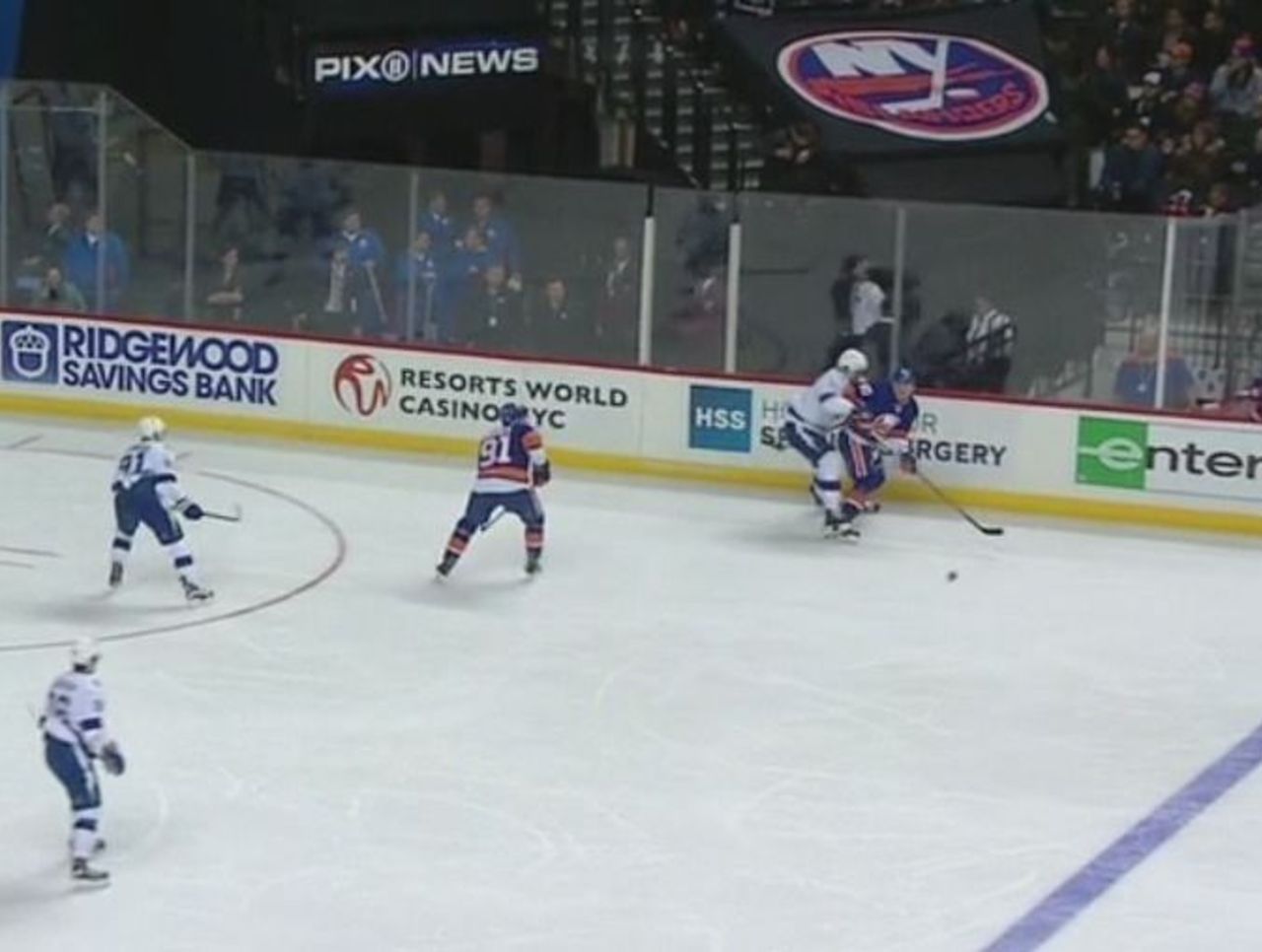 Kucherov gobbled up the puck, and skated with haste down the ice. He entered the Islanders' zone with Boyle to his left, and Stamkos (91) - who was being watched by John Tavares (also 91) - trailing behind.