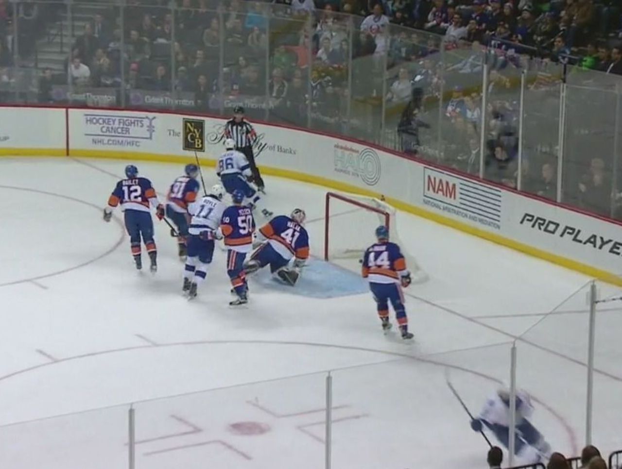 Kucherov skated toward Calvin de Haan (44), and instead of attempting a shot through a possible screen, he dropped the puck past Tavares and back to Stamkos.