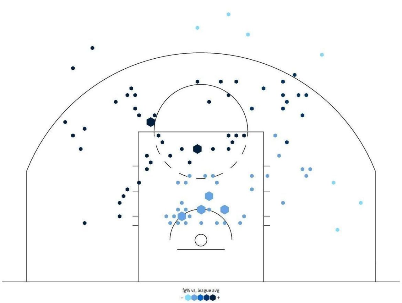 DeRozan, a 44.4-percent shooter for his career, is making shots at a blistering 55.4-percent clip through four games so far in 2016-17. He has been especially effective with his mid-range shots, as shown with the shot chart below; the darker hexagons indicate areas of the court where DeRozan exceeds the league average in shooting percentage: